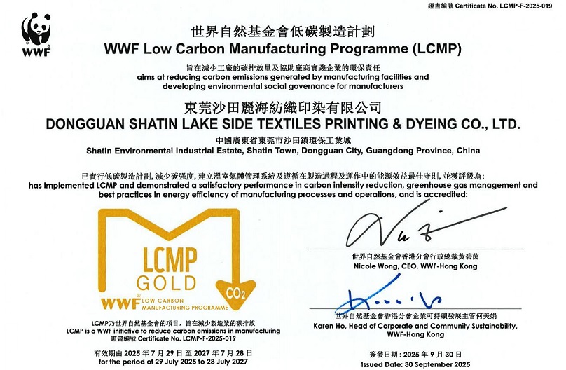 10月13日,沙田丽海公司获得世界自然基金会(WWF)香港分会颁发的低碳制造计划(LCMP)黄金标签认证证书,这是沙田丽海公司第7次获得该荣誉。